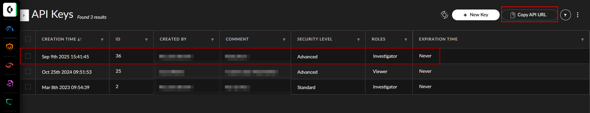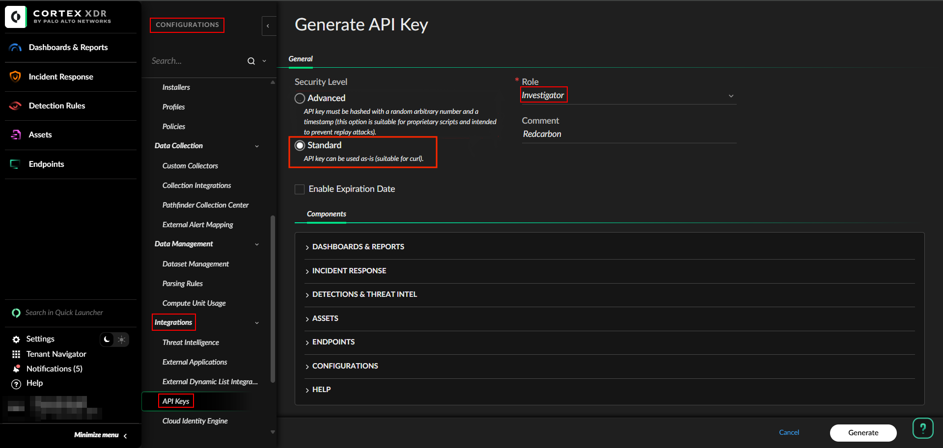 Set the Security Level to “Standard” and Role to “Investigator” and generate a new key.