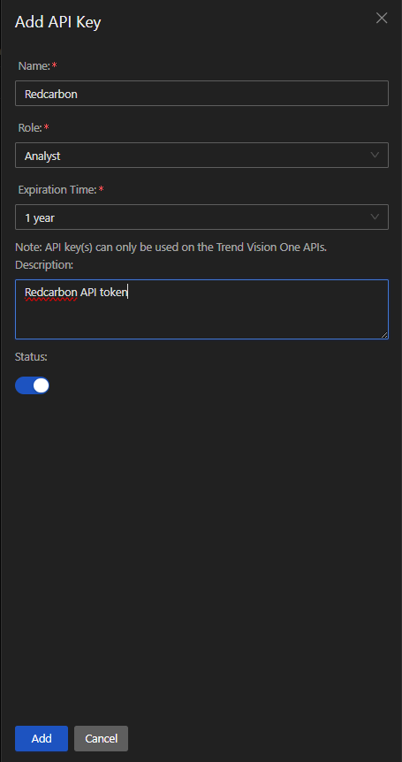 From TrendMicro Vision One panel, go to Administration ⇒ API Keys ⇒ Add API Key